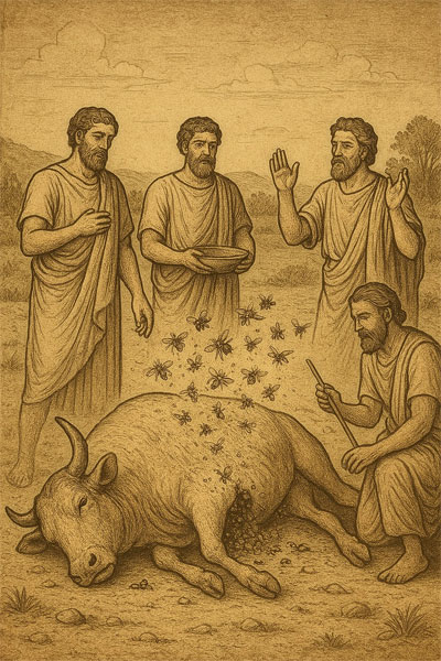Bugonía es la antigua creencia mediterránea donde se pensaba que las abejas nacían espontáneamente del cadáver de un buey o vaca.