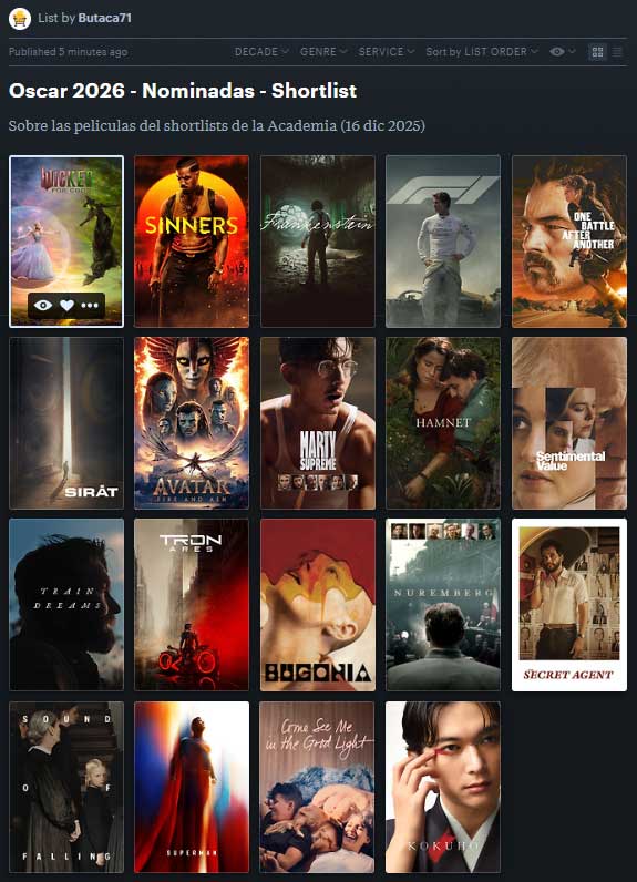 Oscar 2026 – ShortList – 16 de diciembre de 2025